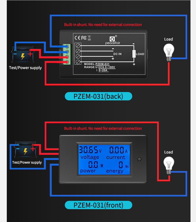 - Test range: DC6.5-100V and 0-20A (PZEM-031)