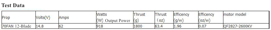 With QF2827-2600KV motor, this 12-blade 70mm duct is powerful and efficient! It features low temperature. It boasts 4S performance and 1800G thrust.