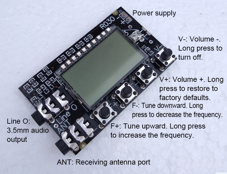1. Short press the F+ button to search for radio stations upwards. After the station is found, it will stop and play this station. Long press the F+ button to increase the receiving frequency by 0.1MHz.