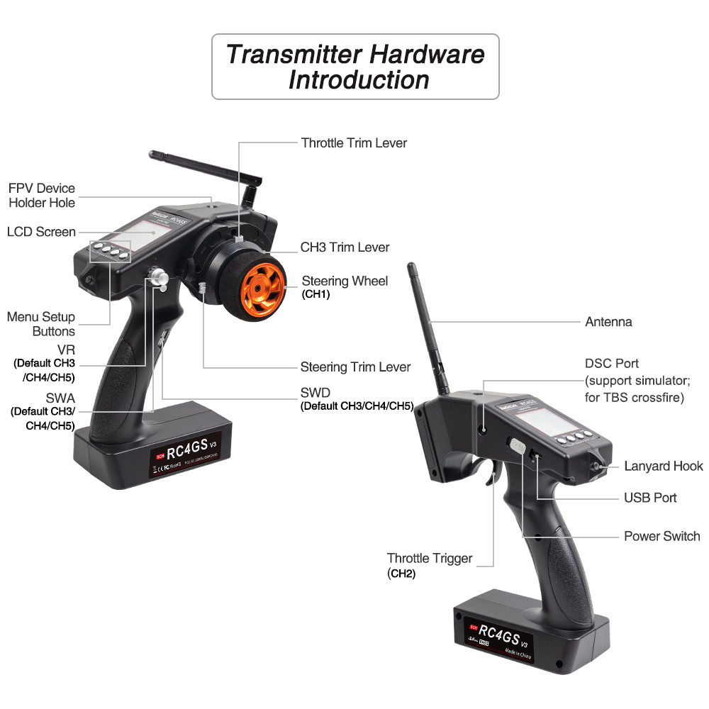 - 5 Channels: CH3-CH5 can be customized. The middle of the handle SWD switch, user can personalize by changing SWA to SWD.