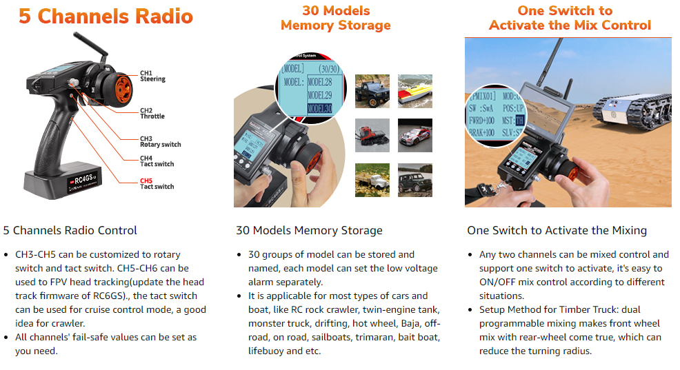 - Dual Programmable Mix Control: Mix control can be programmed with any two channels and you could set one switch to active the different mix control. That's friendly for twin-engine vehicles, such as tanks, boats.