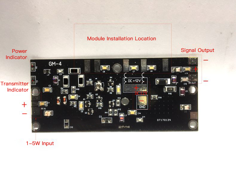 1. First fix the board to heat sink (the module should not be welded first), then connect it to walkie talkie, connect 12V power supply required by the board and then power on.