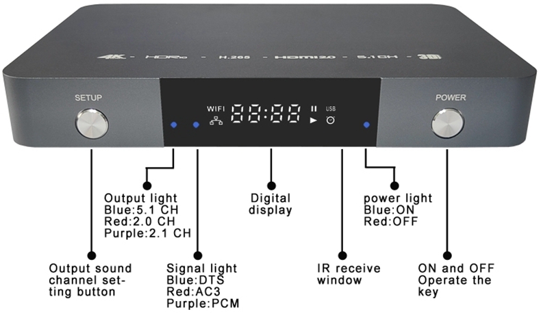 A: This machine supports 5.1 channel decoding output and fiber source code output external power amplifier decoding. If there is no 5.1 surround effect, please check whether the audio settings of this machine select SPDIF Pass through output, and then check the color displayed on the panel signal indicator light. Blue is the DTS audio signal, red is the Dolby AC3 audio signal, and purple is the ordinary 2-channel PCM signal, This product will display different signal formats based on the played sound source, and check whether the connected rear stage is a true 5.1 channel amplifier or active speaker.