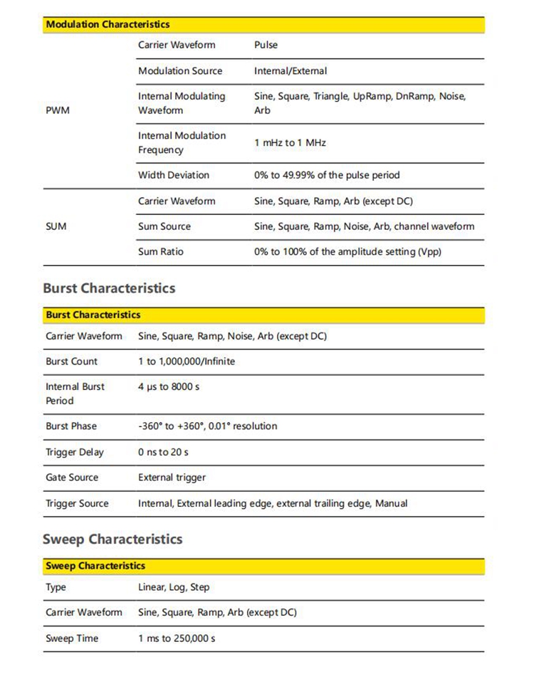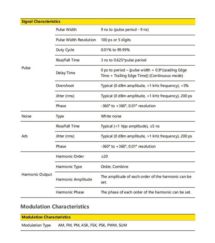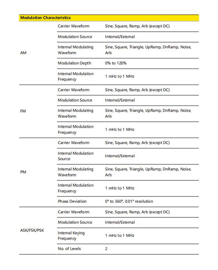 - Support rich modulation functions (AM, FM, PM, ASK, FSK, PSK, PWM, SUM modulation functions, etc.) to meet the requirements of communication principles, motor control, switching power supply and other application scenarios.