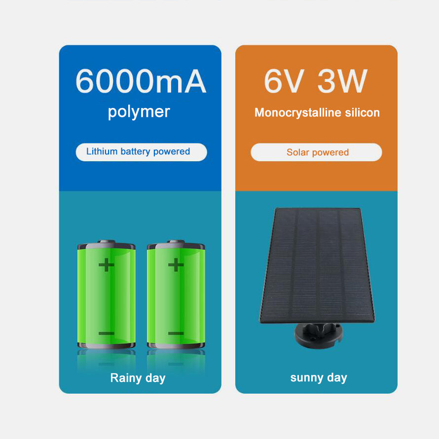 - Dual-mode power supply, battery life 365 days. Built-in 6000mA polymer lithium battery + 6V 3W monocrystalline silicon solar power supply.