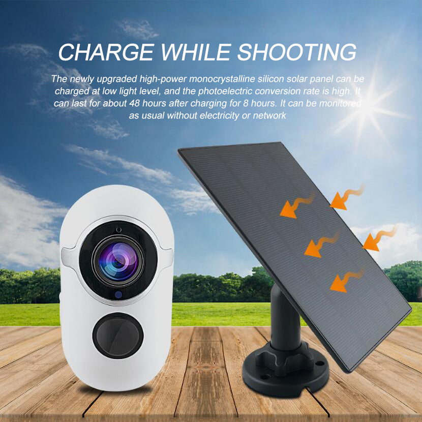 - Charge while shooting, without electricity throughout the year. The newly upgraded high-power monocrystalline silicon solar panel can be charged under low light conditions and has a high photoelectric conversion rate. Charging for 8 hours can last about 48 hours. No electricity and no network, it can work normally.