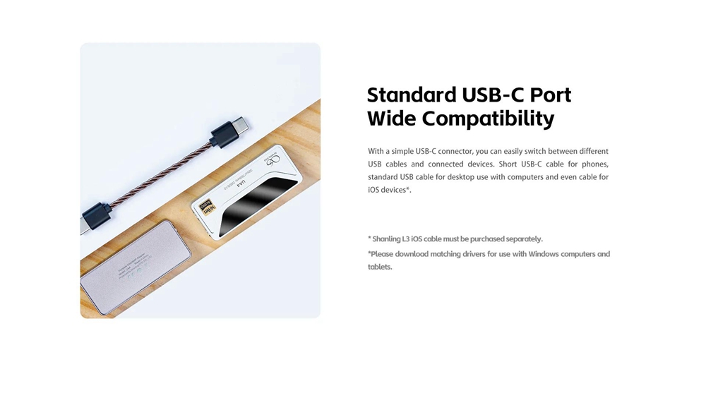- Shanling L3 Lightning-compatible cable needed for use with iOS Lightning-compatible devices