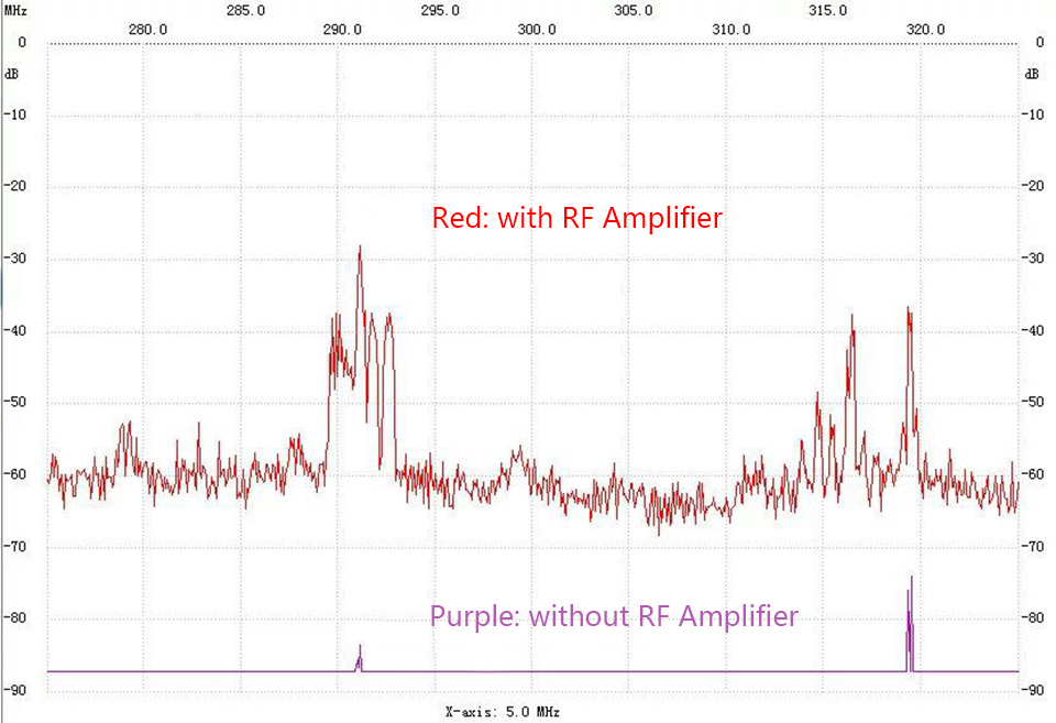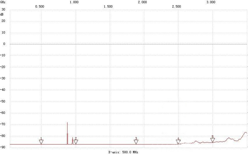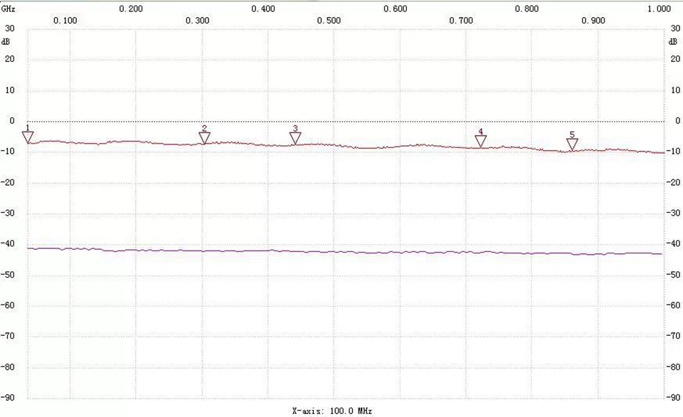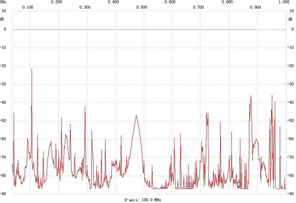 After the RFamp001 signal source is connected to a 40dB attenuator, the measured spectrum of 30MHz-1GHz is received from the spectrophotometer input, and it can be seen that the gain fluctuation is very small, less than ± 2dB.