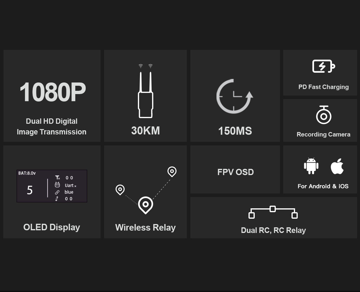 A long-range full HD FPV system with remote control, telemetry, and OSD built-in.