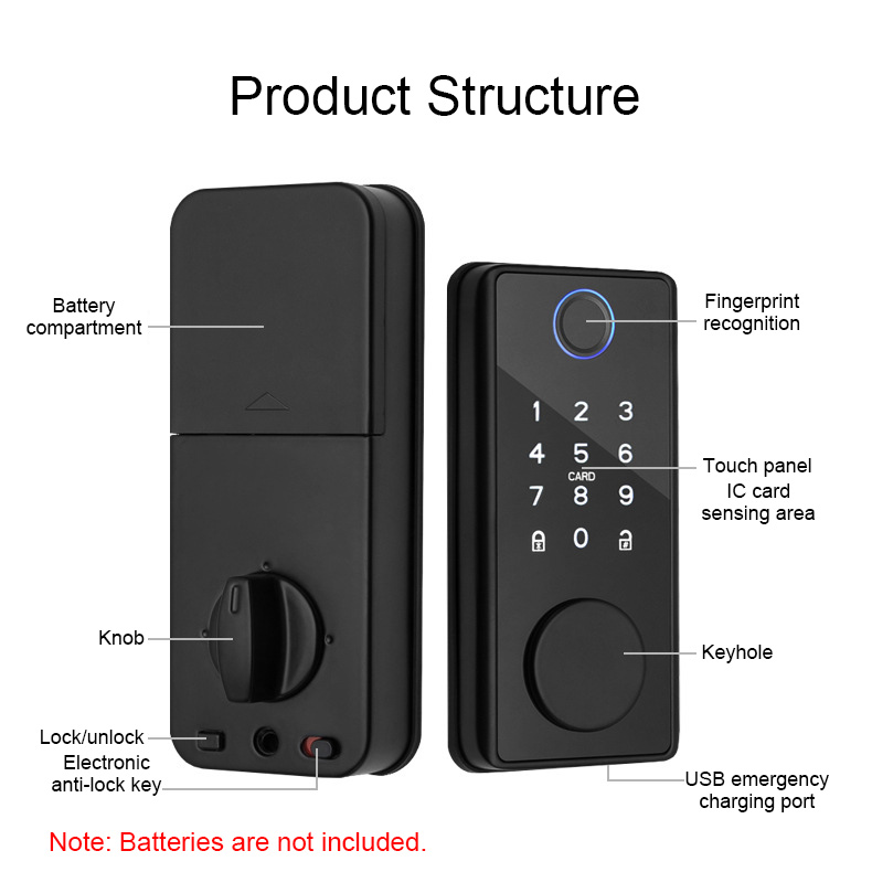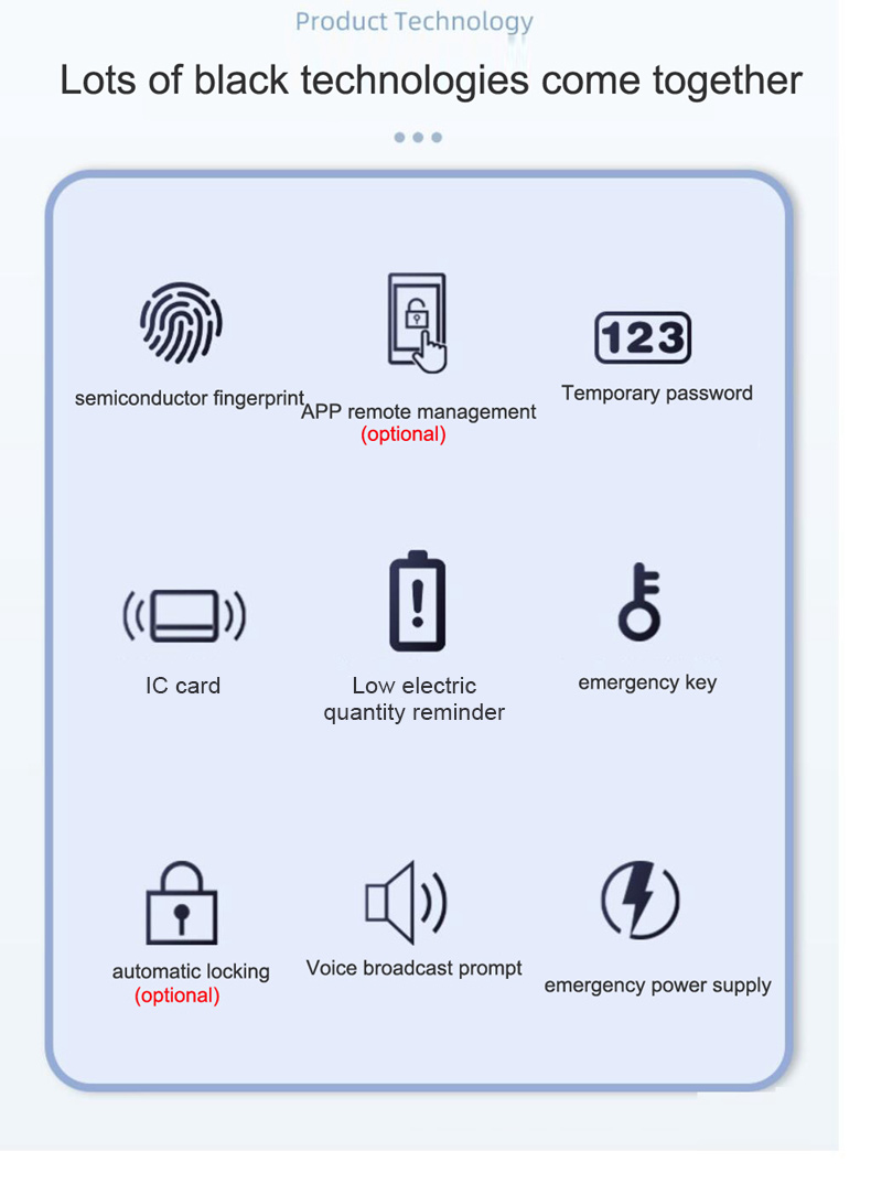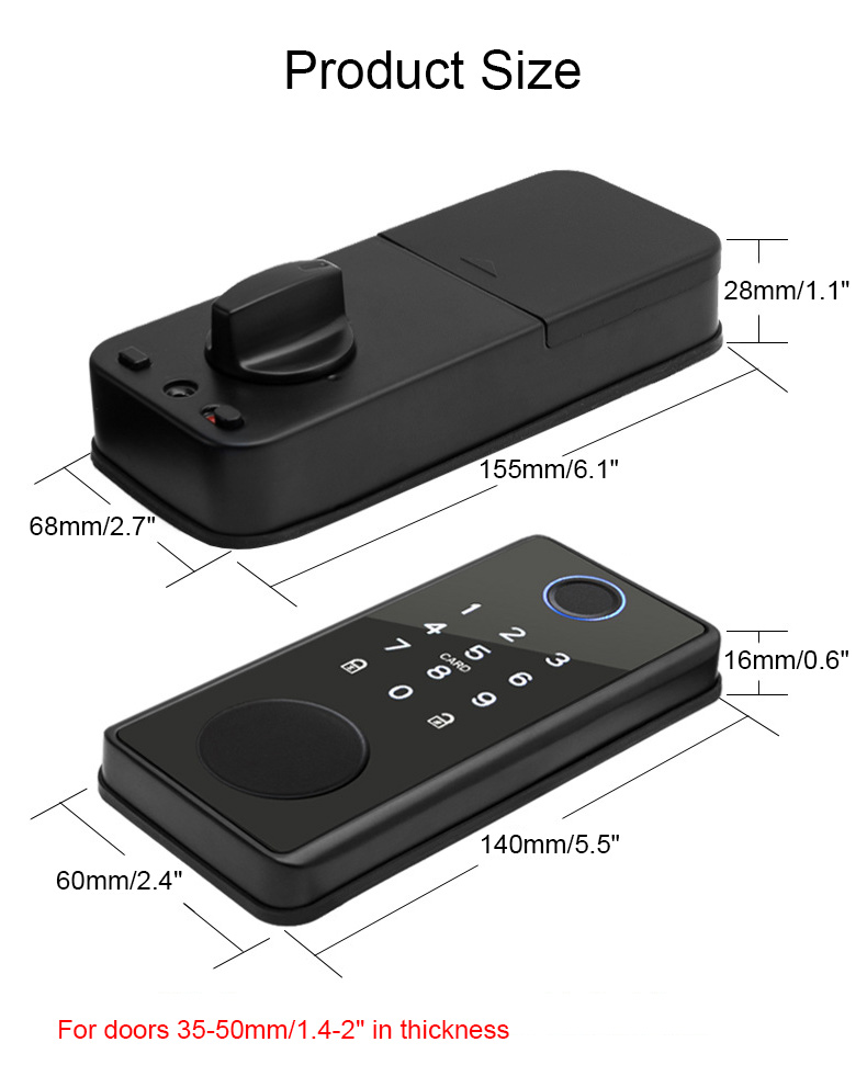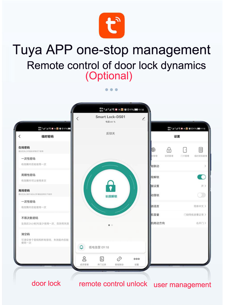 - Unlock method: Fingerprint/password/IC card/key/Tuya APP (optional)