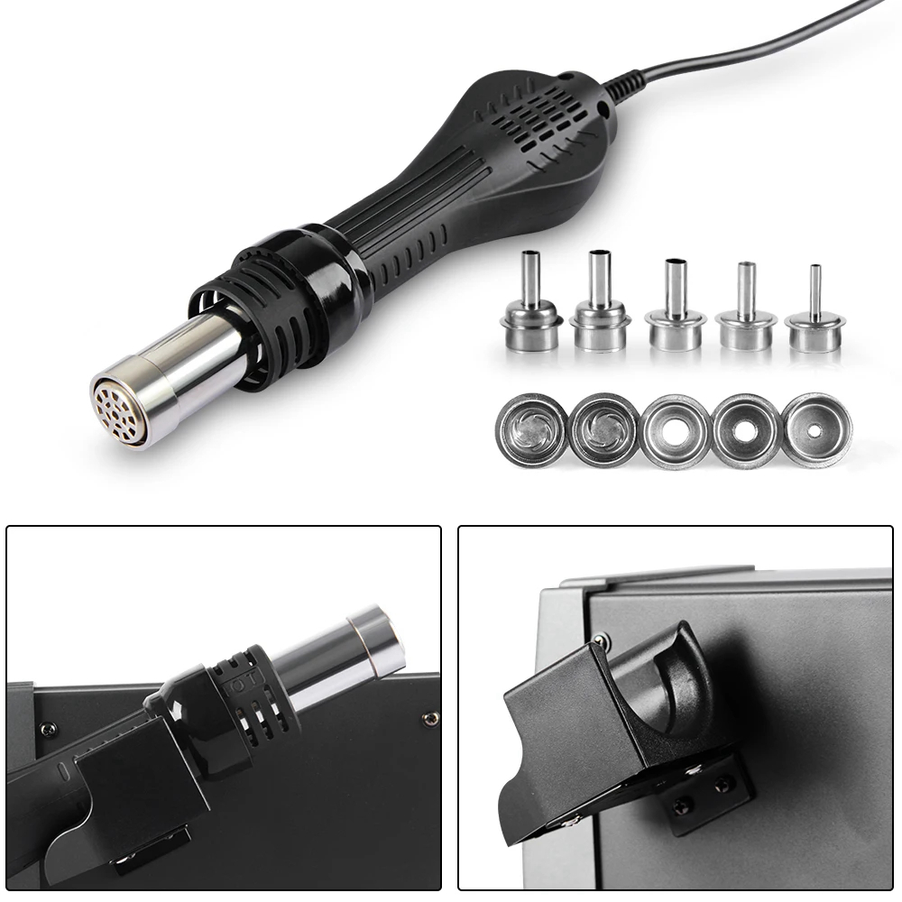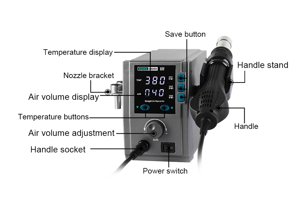- Sensors, closed circuit, the zero passage trigger temperature control of the microcomputer, LED display, big power, rapid heating and accurate and stable temperature will not be affected by the air volume. It enables real lead-free desoldering.