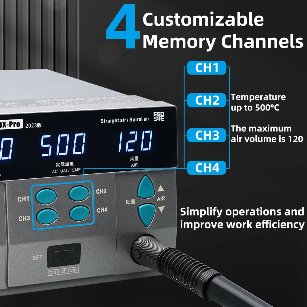 1. Four working channel buttons, i.e. CH1, CH2, CH3 and CH4, which can quickly change the common temperature during work. The air volume and temperature of each channel can be set and stored, so as to achieve more accurate desoldering work and effectively help maintenance personnel work smoothly.
