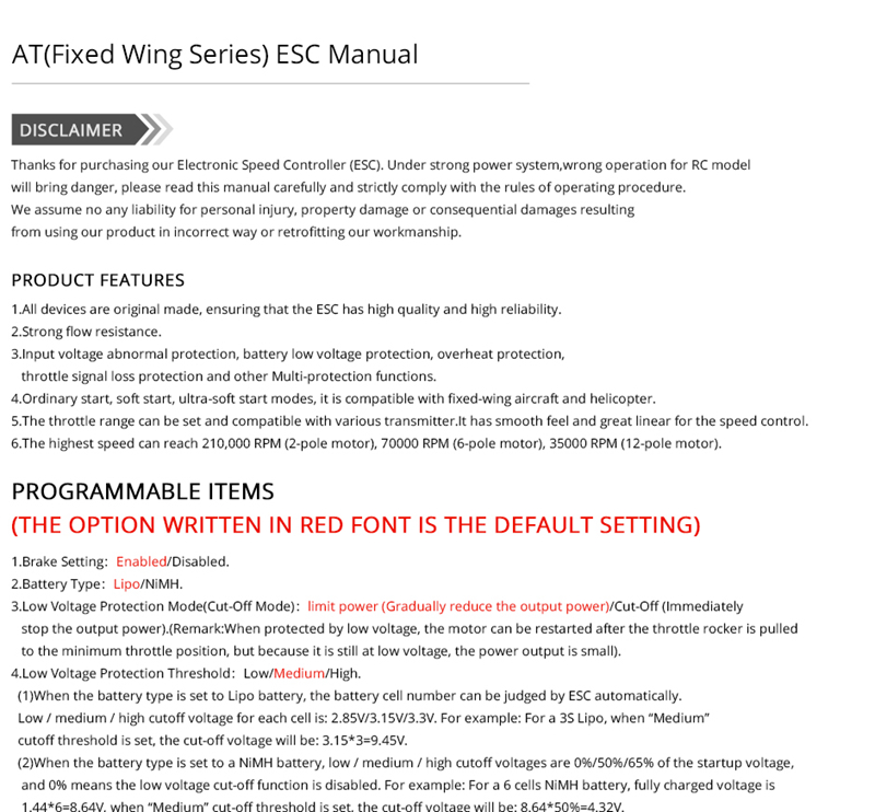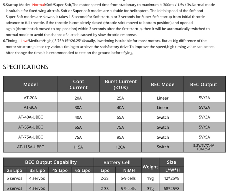 T-Motor Brushless ESC RC ESC AT Series 40A 2-4S For RC Fixed Wing Aircraft (AT-40A-UBEC)