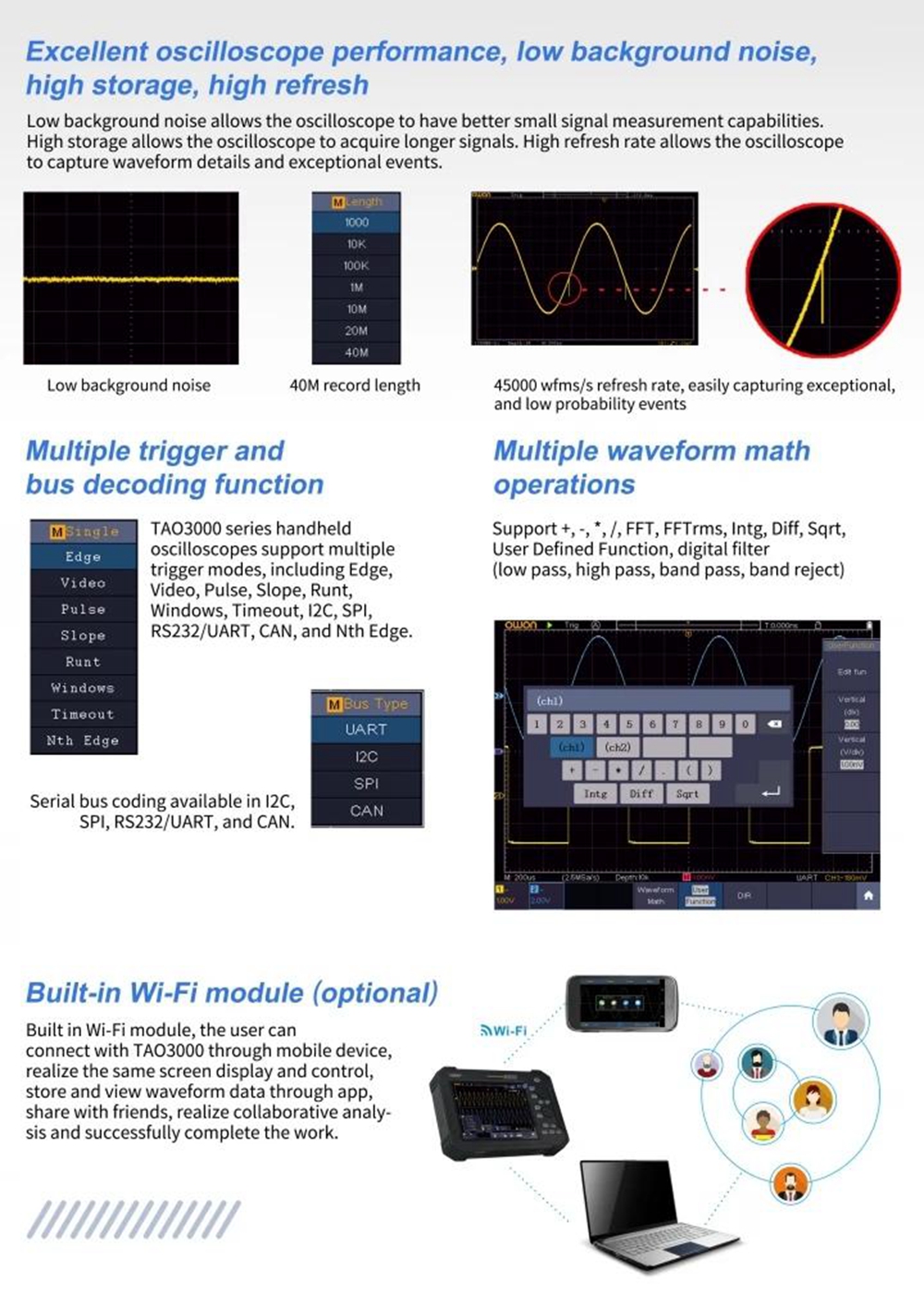 - Max 40M record length; max 45000wfms/s waveform refresh rate