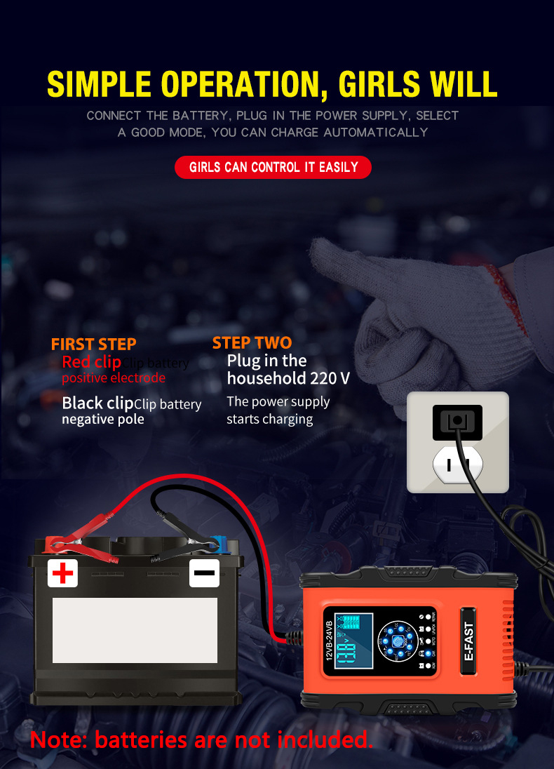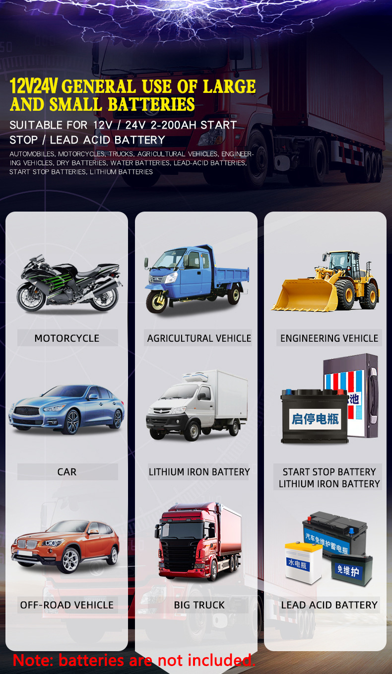 - Types of batteries: Most types of lead acid batteries including Calcium, Gel AGM, LiFePo4, Wet, lead Acid, etc.