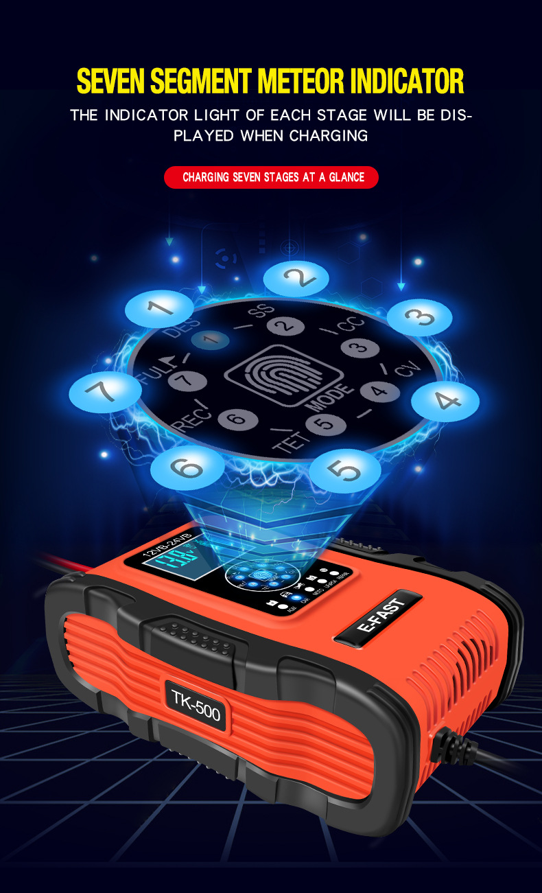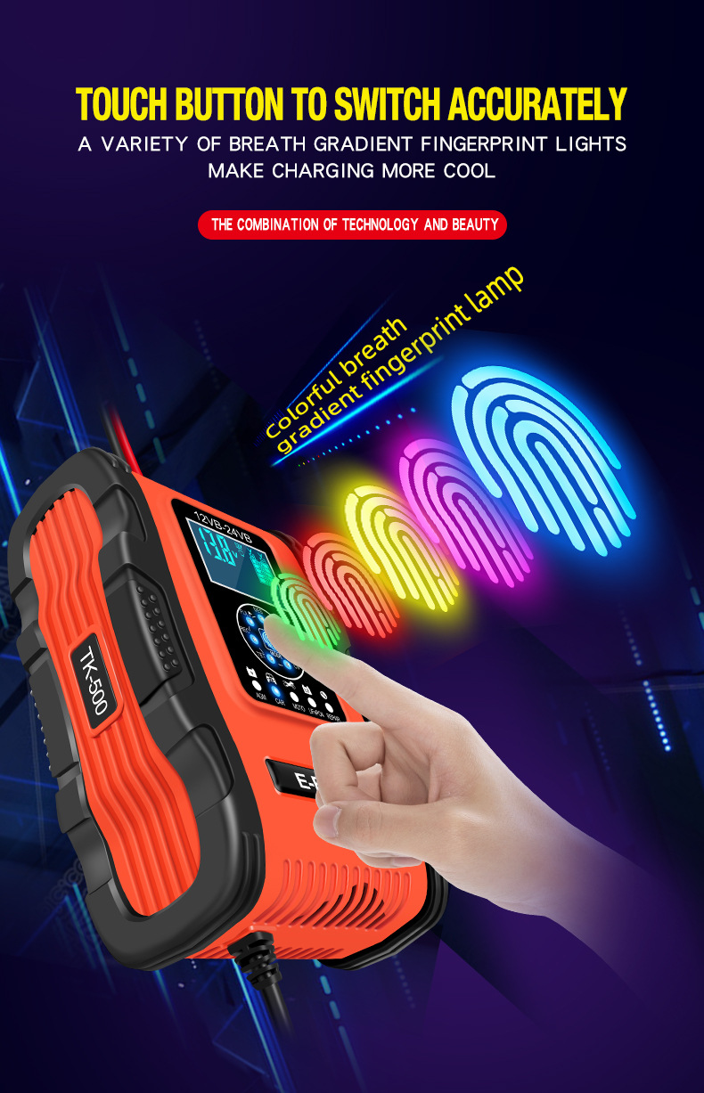 TK-500 12V 24V Battery Charger 7-Stage Car Battery Charger for Lead-Acid Battery Lithium Battery