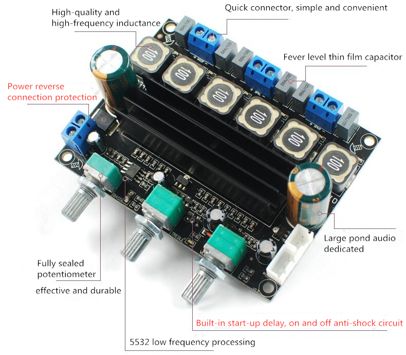 3. The output power depends on the power supply voltage and the speaker impedance. The recommended voltage for high-power occasions is 24V, and the current is more than 5A. Use a 4 ohm speaker for high power.