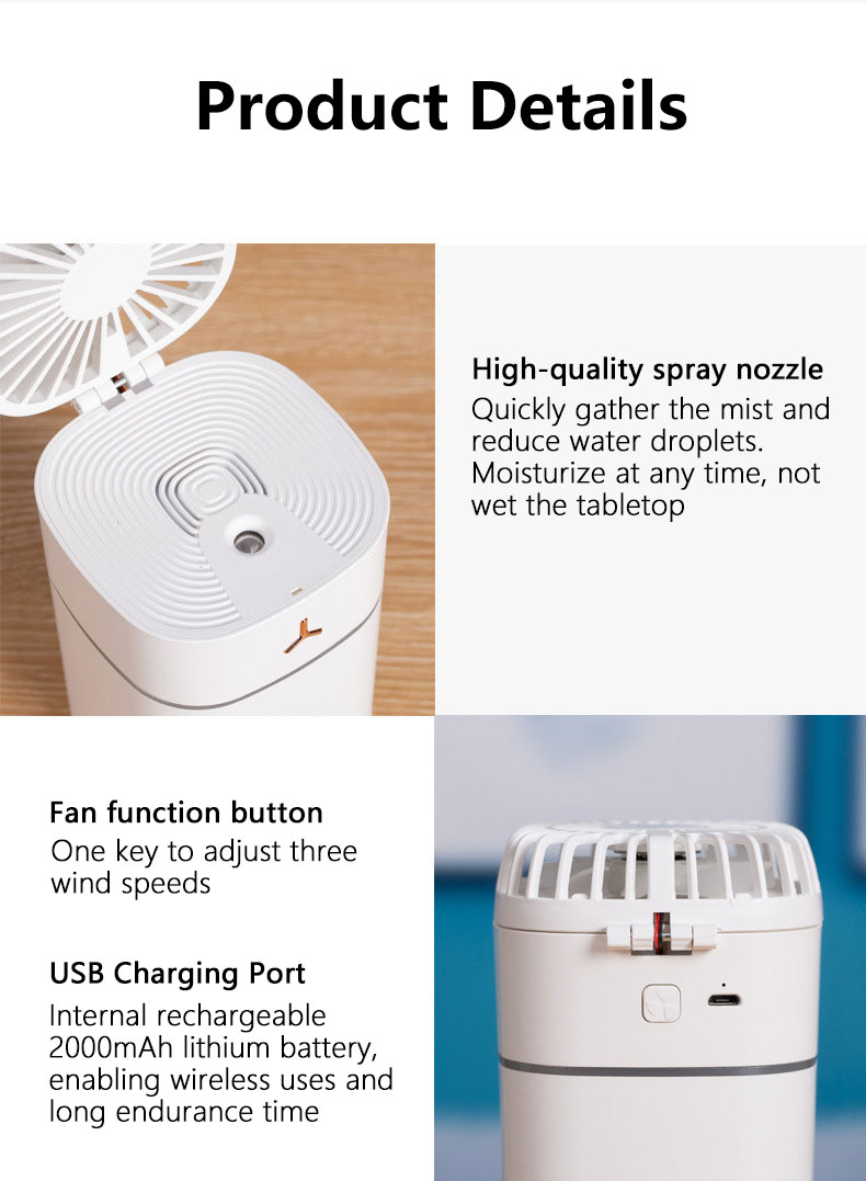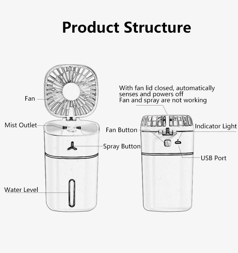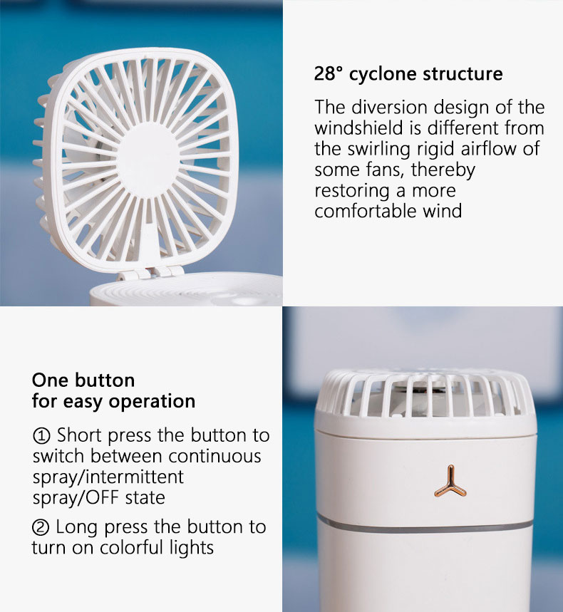 - Spray + fan: Increase the air supply area and instantly cool down. Spray humidification, instantly cool down
