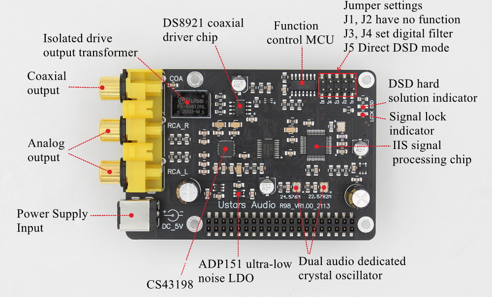 Ustars Audio R98 Digital Audio Decoder Board I2S IIS Digital Player 384K DSD256 For Raspberry Pi