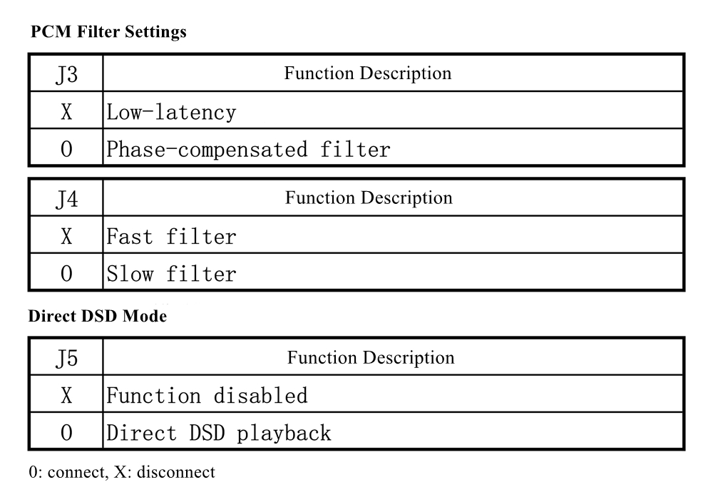 - Direct DSD Mode: DSD signal is passed through without DSD digital filter, which is NOS mode. This mode only plays DSD music files, which is valid when the jumper J5 is connected