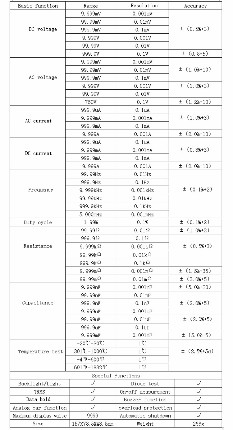- Full functioning. Voltage, current, resistance, capacitance, frequency, temperature, TRMS, duty cycle, analog bar, diode and continuity test