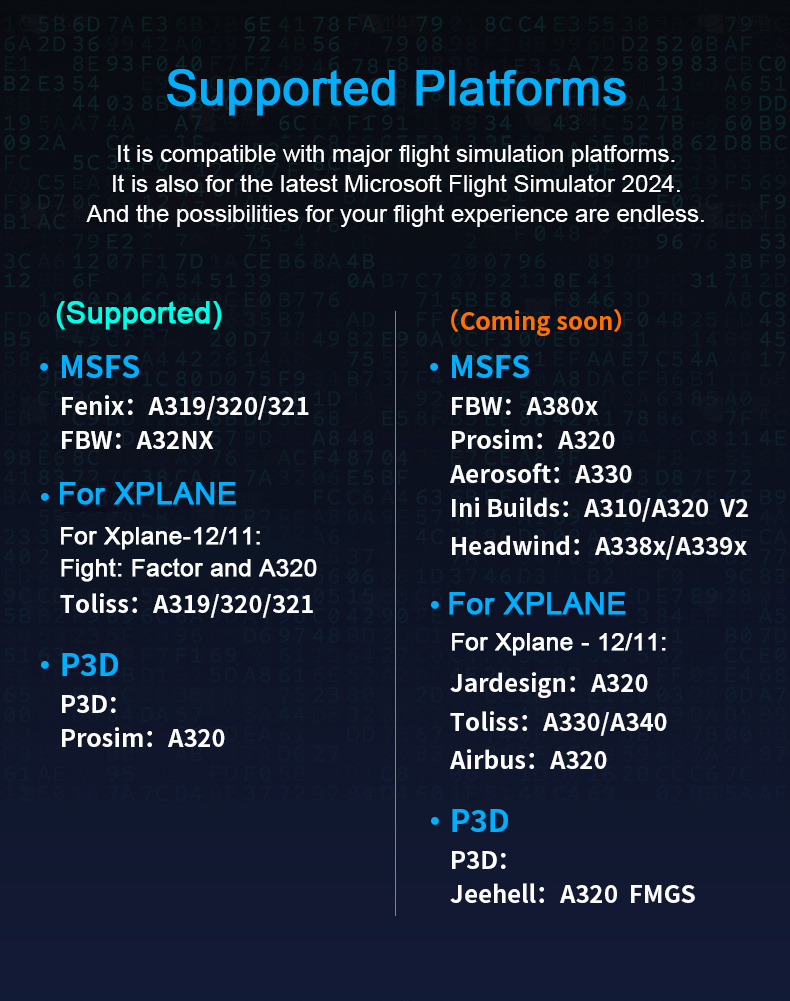 * Supported platforms: Compatible with major flight simulation platforms. It is also for the latest Microsoft Flight Simulator 2024. And the possibilities for your flight experience are endless.