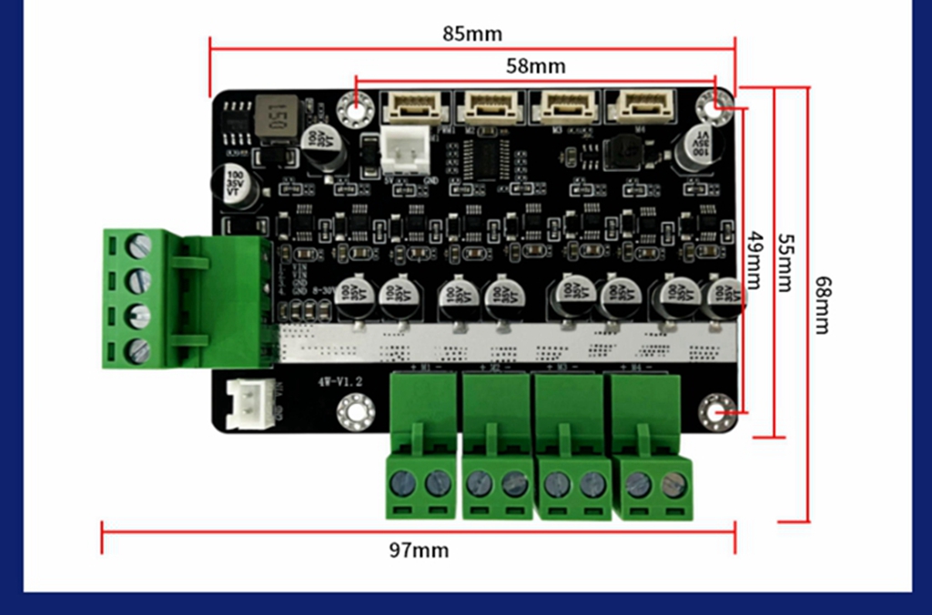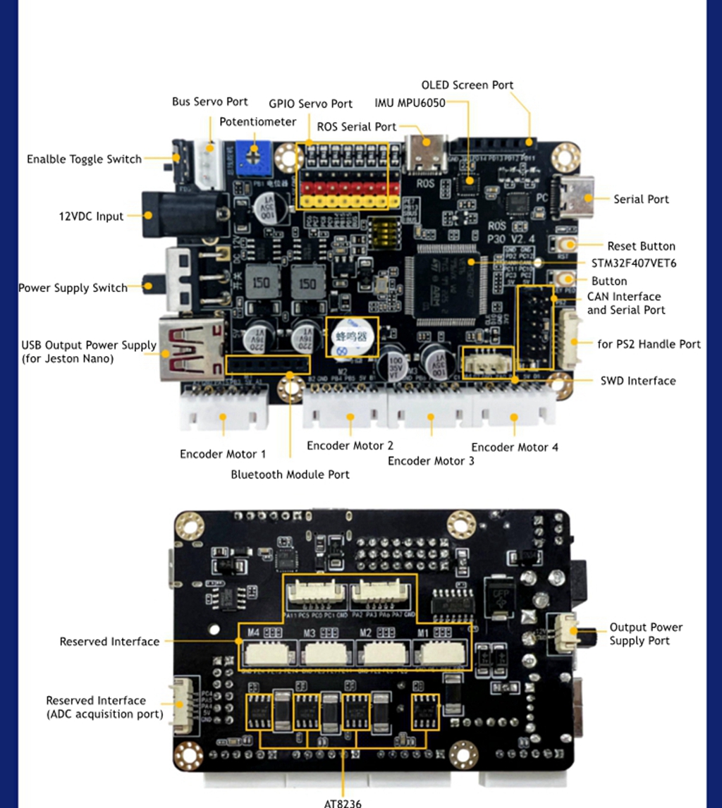 - Supports 4-channel DC encoder motor (PID), integrated motor driver chip is AT8236, with a maximum current of 2A.