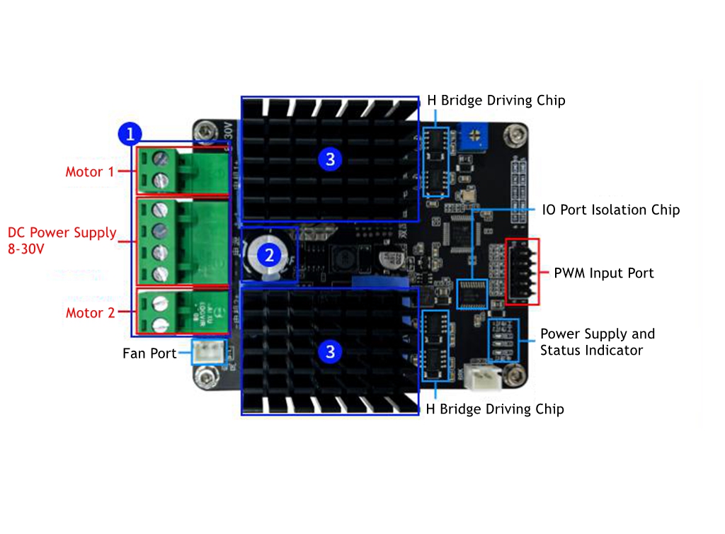 - Supported PWM duty-cycle range: 0% - 100% (the larger the duty cycle, the faster the speed)