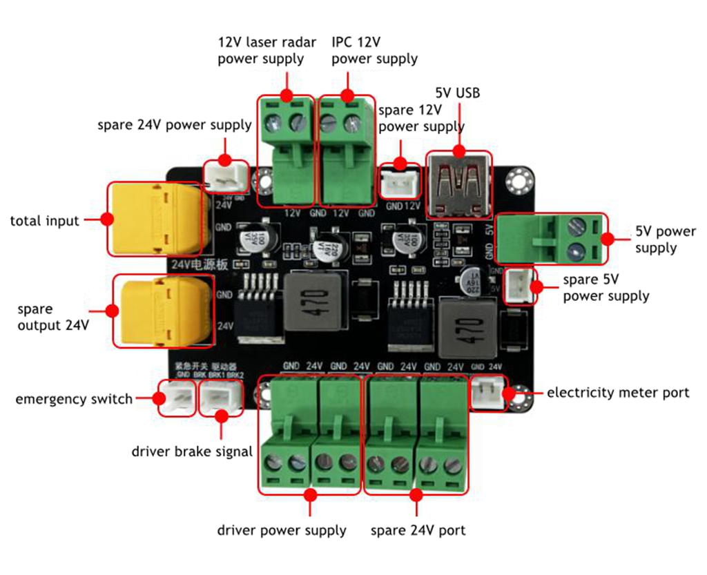 - Providing a power distribution board with reserved 5V, 12V, and 24V power supply interfaces.