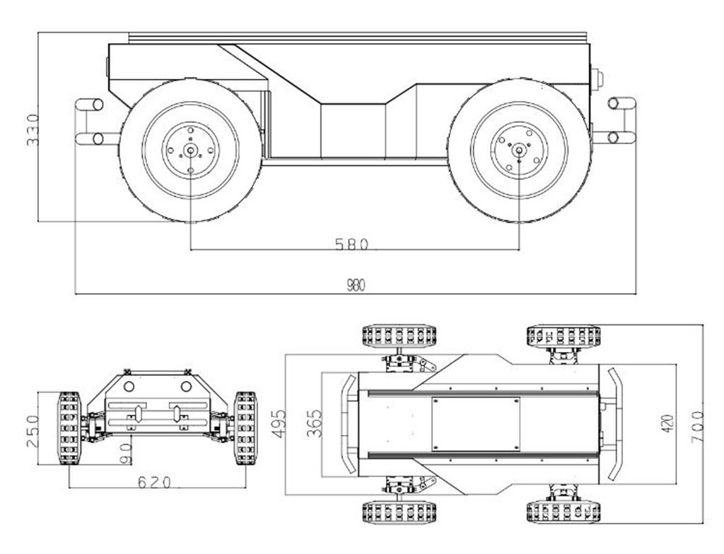 - Motion form: front wheel turn and rear wheel drive, Ackermann steering