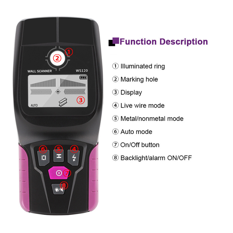 It is a multifunctional wall detector. It pinpoints the location of ferrous and non-ferrous metals, wood and wires under walls. The wall scanner can prevent metal pipes, steel bars and wires from being drilled, making it safe to drill holes.