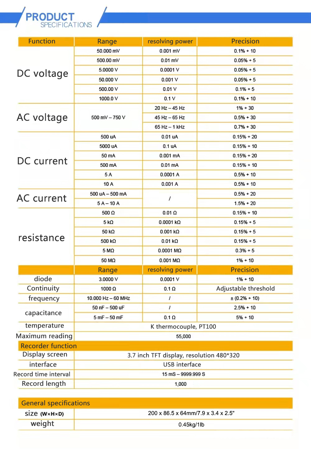 1. Display 55000 counts, and the accuracy of DC voltage is up to 0.05%.