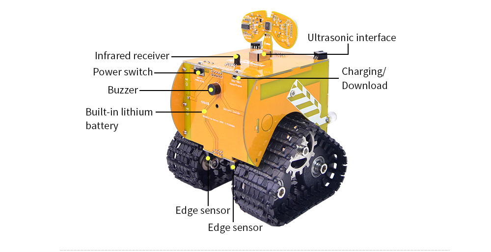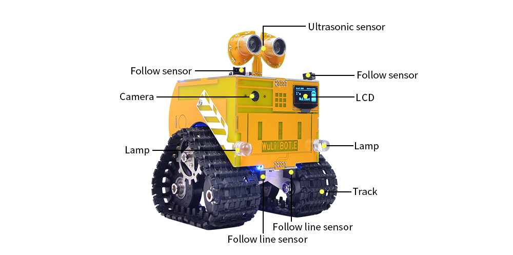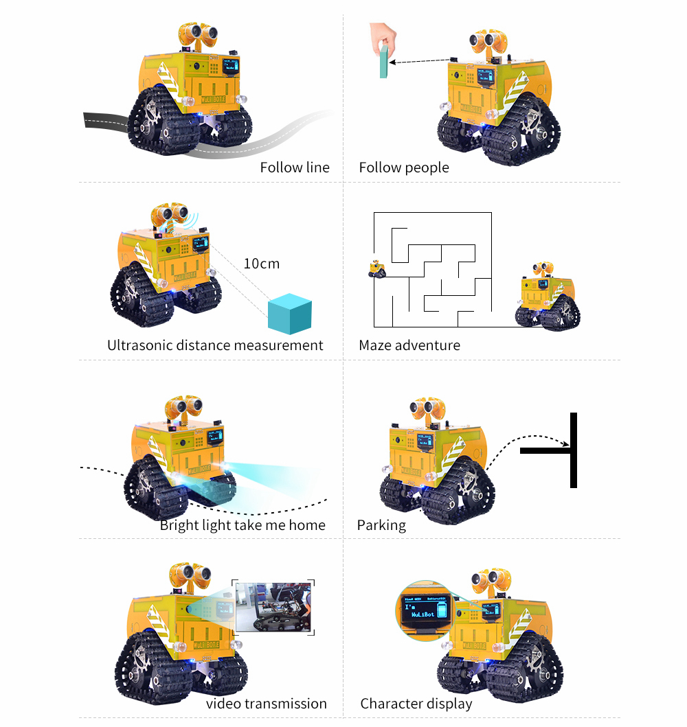 1. It is an educational robot for beginner to learn the knowledge of STEAM, and it has variety of functions, such as following, ultrasonic distance measurement, maze adventure, and gesture control.