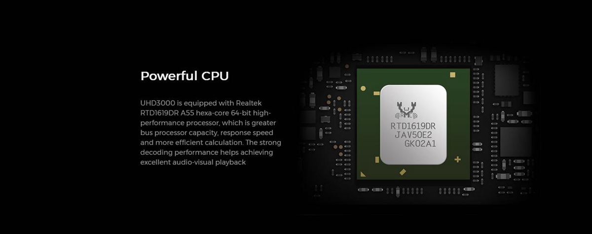 - A new generation of Realtek RTD1619 DR hexa-core 64-bit A55 CPU with larger bus processing capacity and faster computing efficiency.