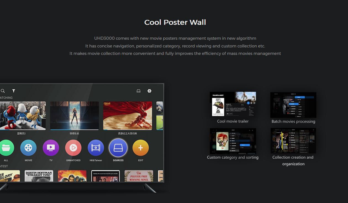 - Home Theater app supports automatic poster scanning, movie trailers and custom classification and management.