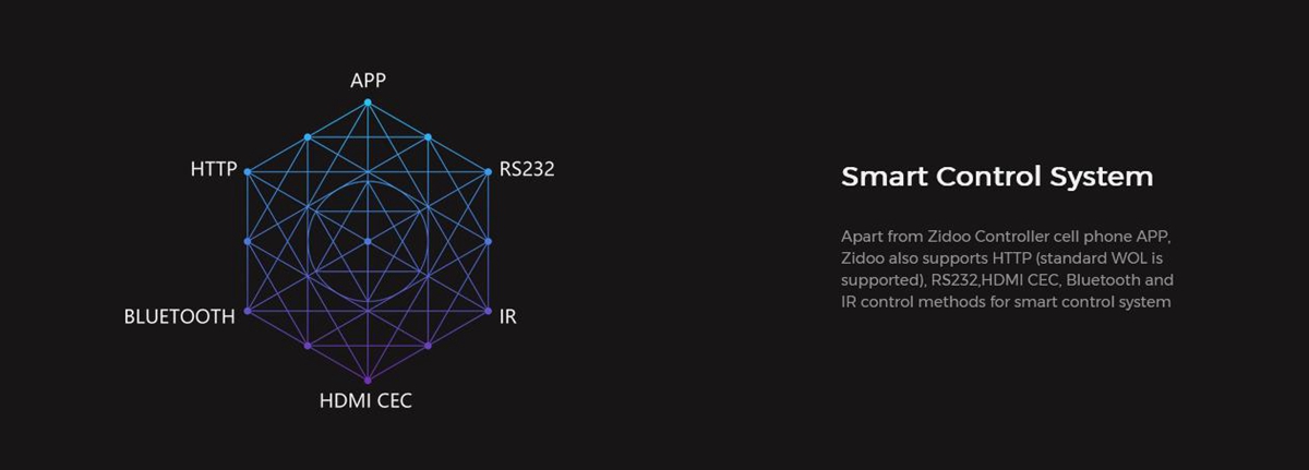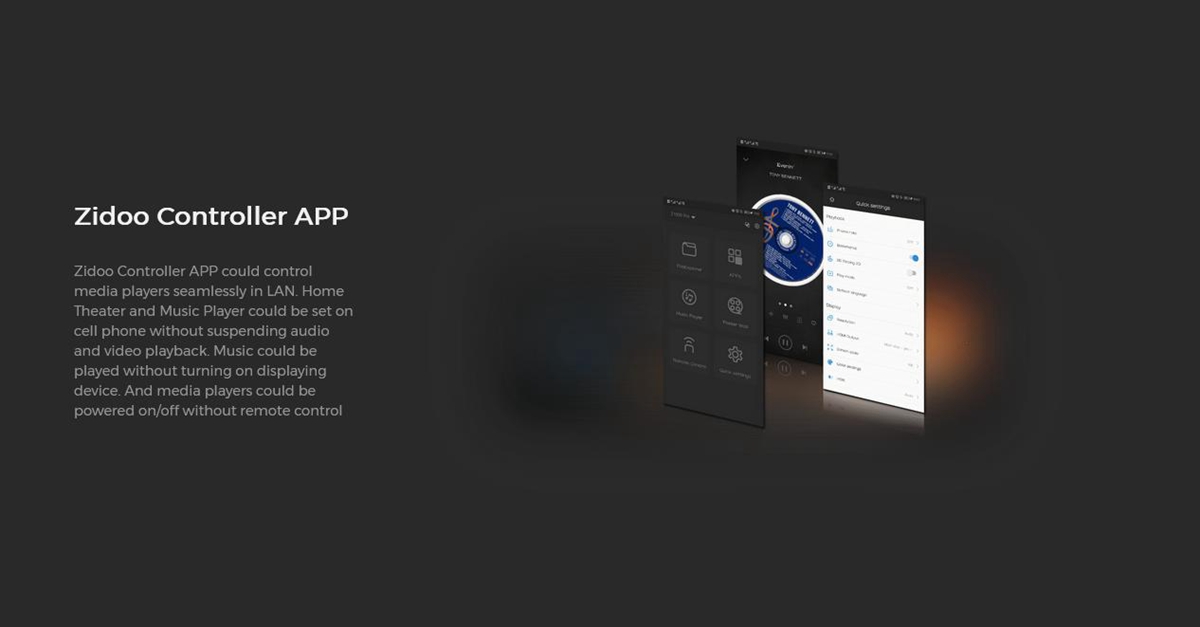 - Supporting the exclusive ZIDOO Controller APP for iOS and for Android mobile phones, which can seamlessly play and control ZIDOO media players (on/off can be controlled).