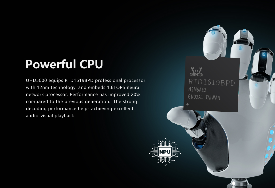- A new generation of Realtek RTD1619BPD Qual-core 64-bit A55 CPU with larger bus processing capacity and faster computing efficiency.