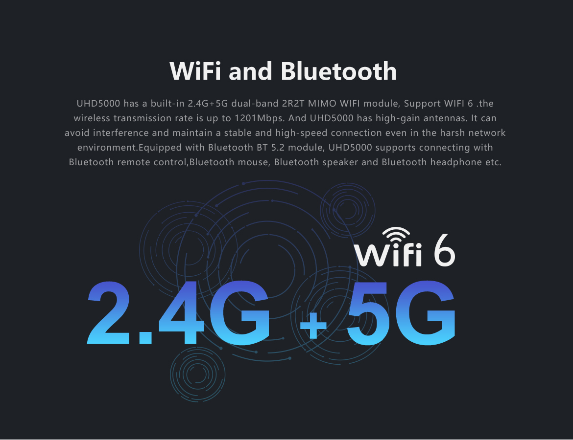 - WiFi: 2.4G + 5G Dual Band WiFi, 802.11 a/b/g/n/AC/AX 2T2R , 802.11ax MIMO OFDM