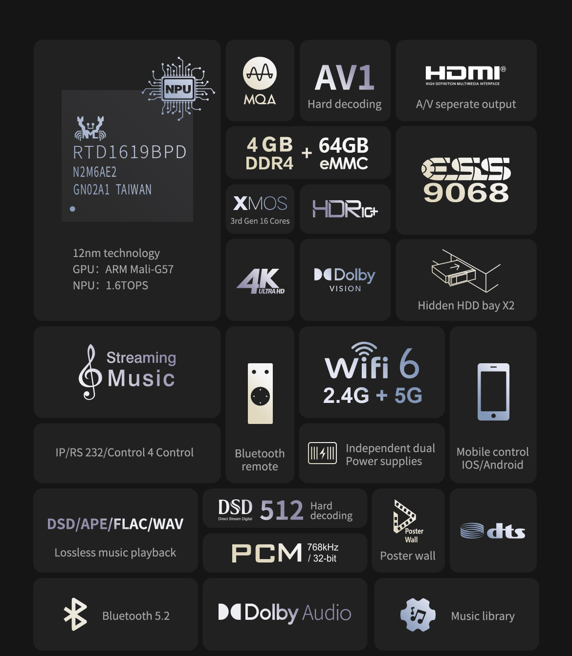 - Audio decoding: support HD audio passthrough and decode 2 channels Built-in for XMOS + ES9068 DAC, supporting for DSD/MQA decoding