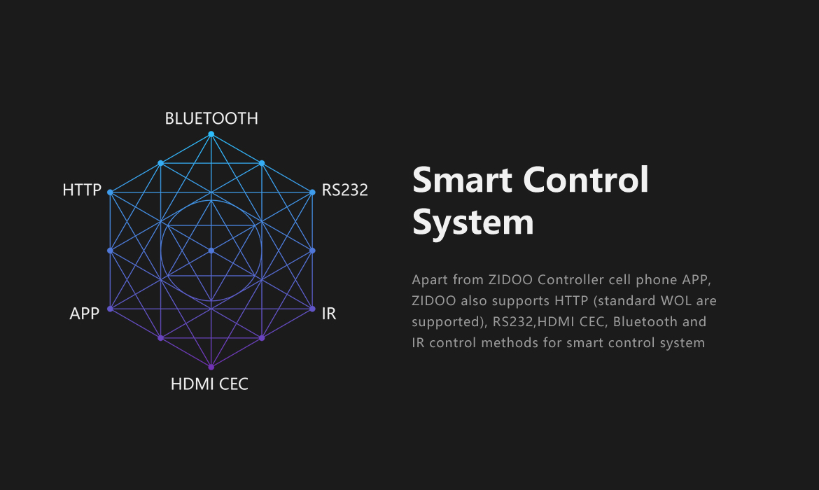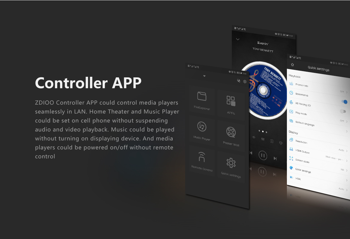 - Supporting the exclusive ZIDOO Controller APP for iOS and for Android mobile phones, which can seamlessly play and control ZIDOO media players (on/off can be controlled).