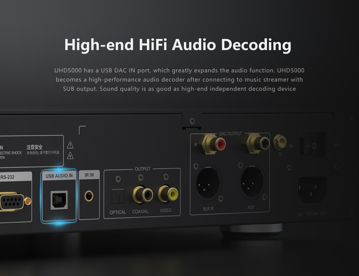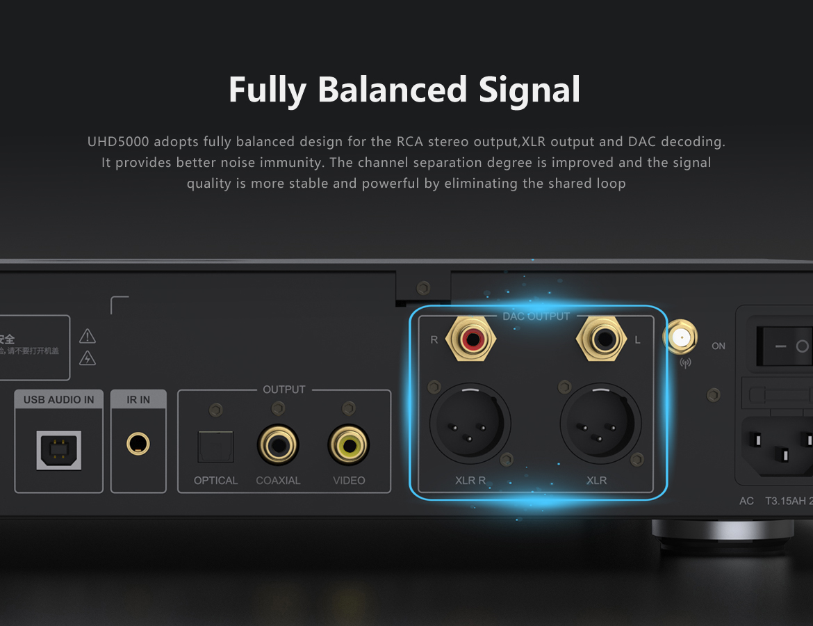 - High-fidelity audio decoding supports XLR full balance and RCA analog audio output.