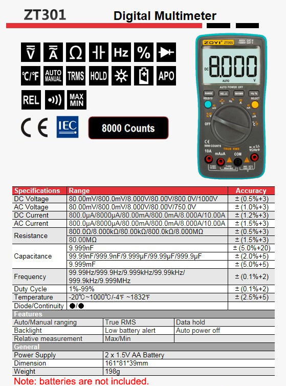 ZOYI ZT301 8000 Counts Digital Multimeter Voltmeter Ammeter Resistance Capacitance Temperature Tester