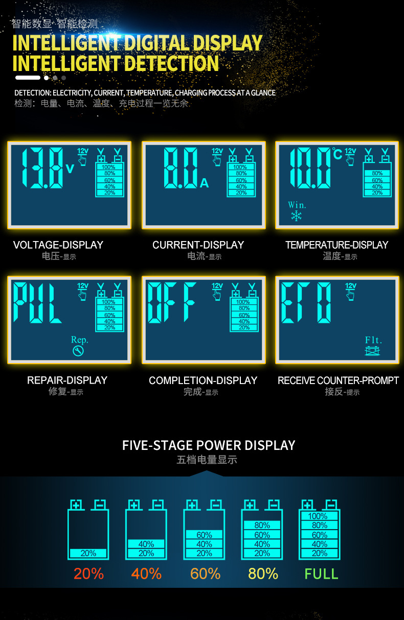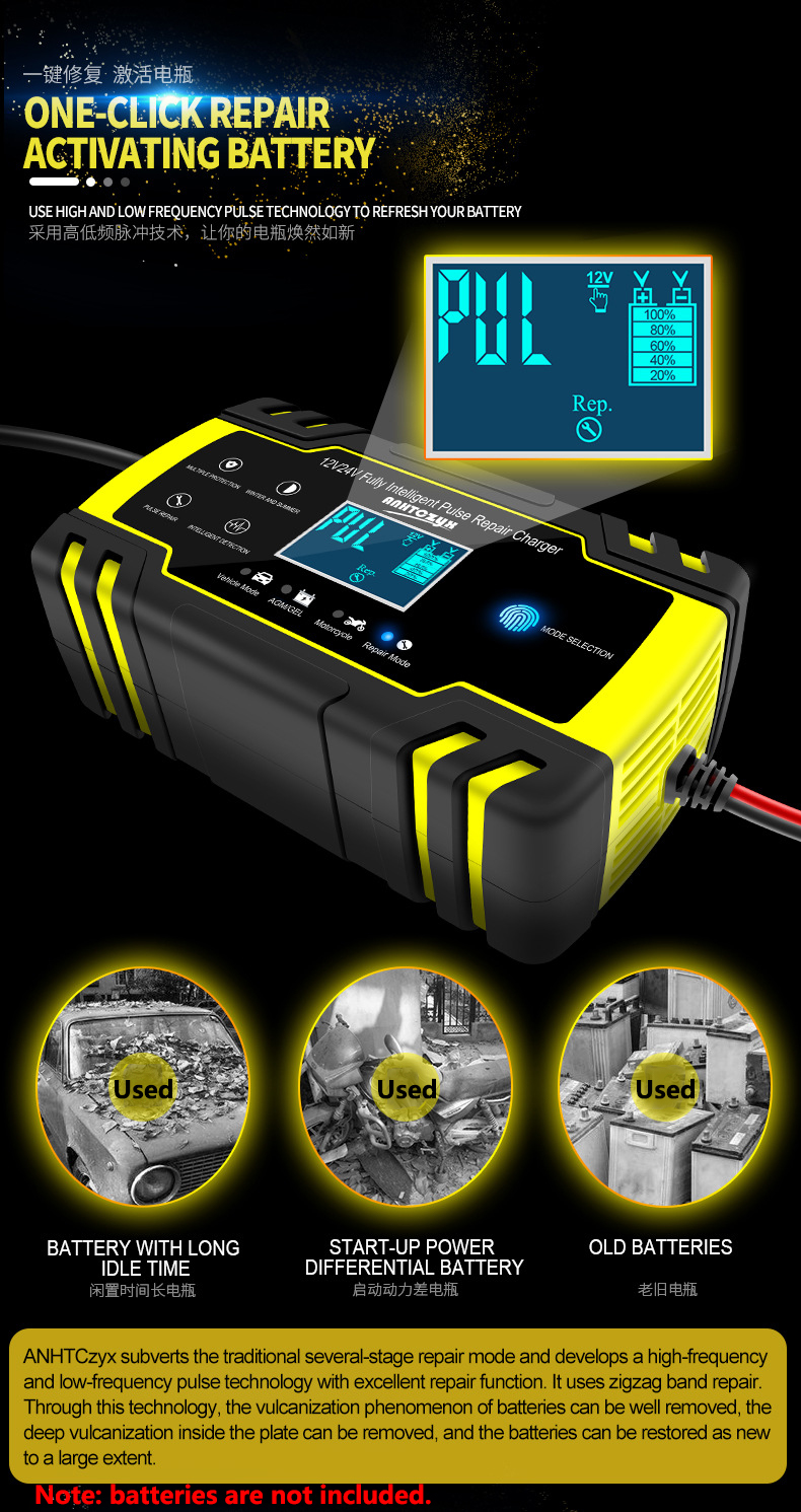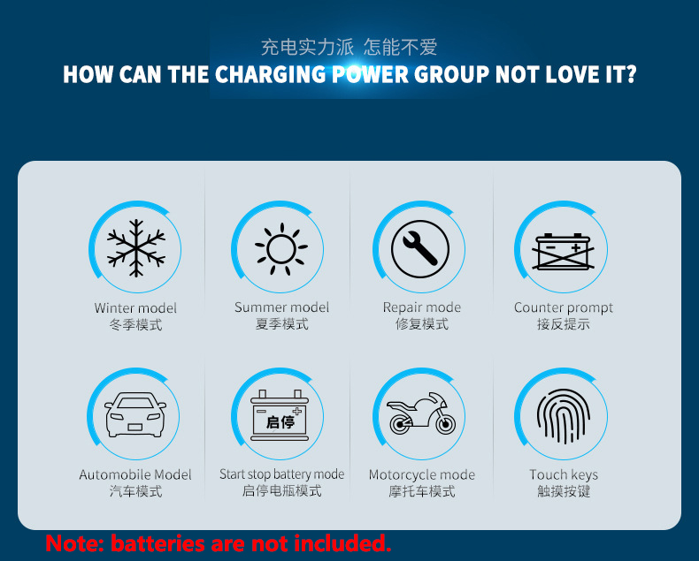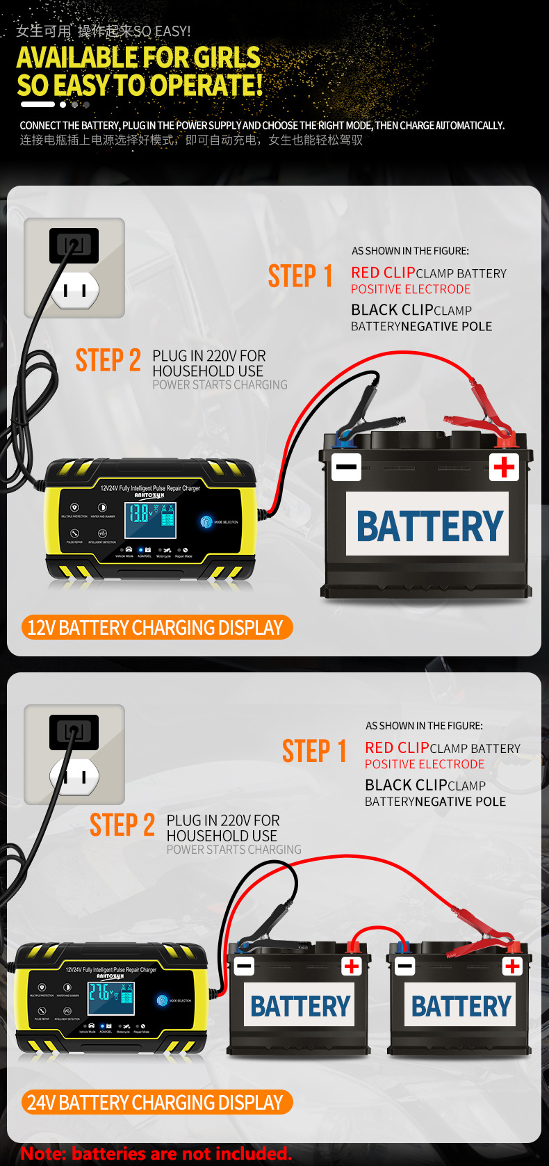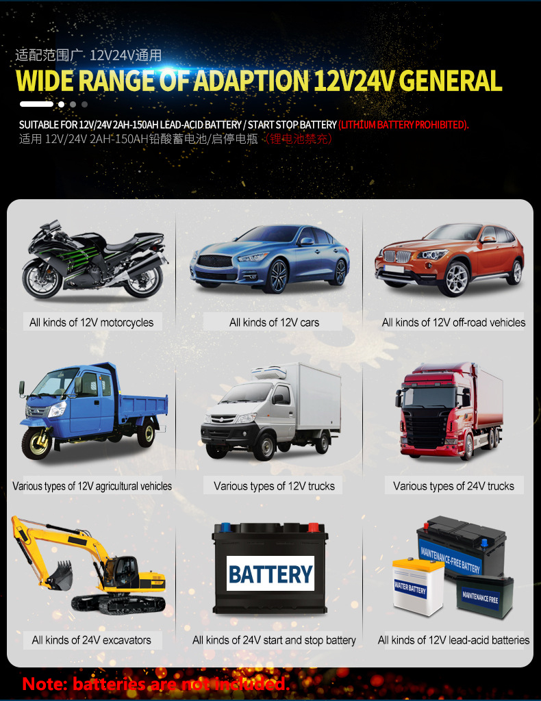 - Scope of Application: 12V/24V 2AH-150AH lead-acid batteries/start-up and shutdown batteries (lithium batteries are not charged)