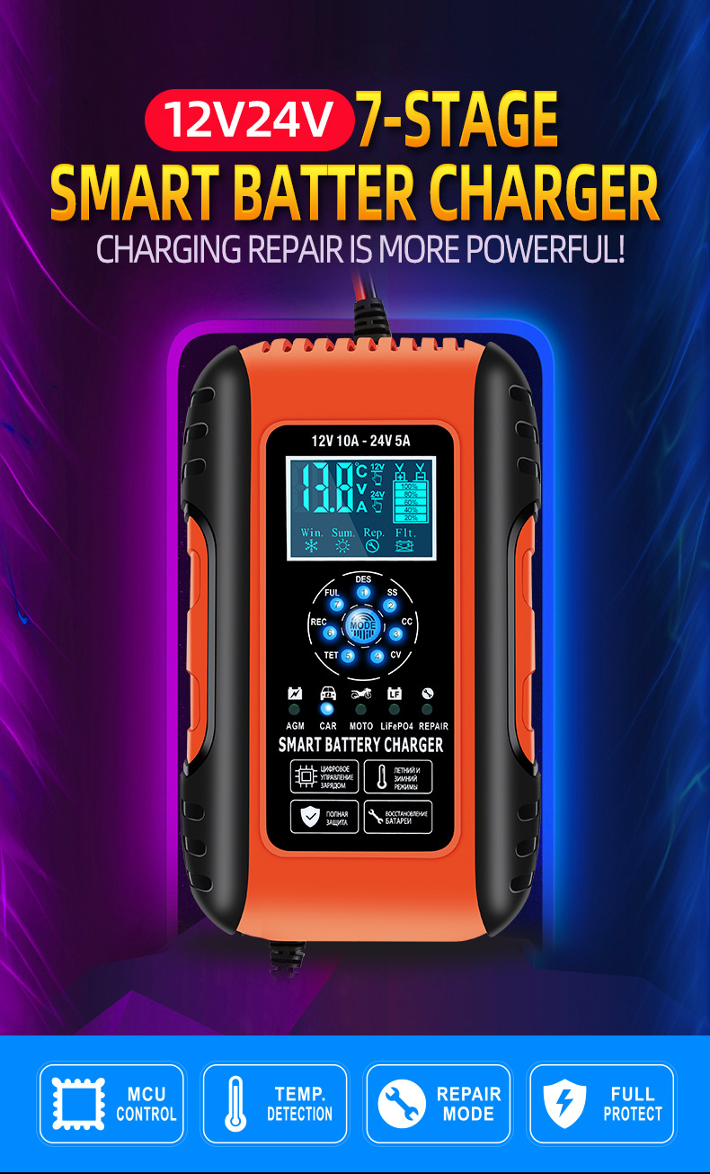 7-stage charger is suitable for most battery types, including Calcium, Gel AGM, LiFePo4, Wet, and lead acid batteries. It may also help restore drained and sulphated batteries.