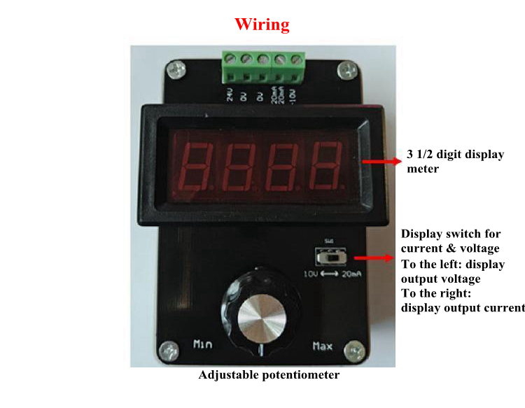 It can generate 0-20mA current signal and 0-10V voltage signal by rotating the precision potentiometer. This signal source can be used for signal source generation, valve adjustment, inverter control, PLC debugging, instrument testing, light-emitting diode testing, and analog transmitter output.