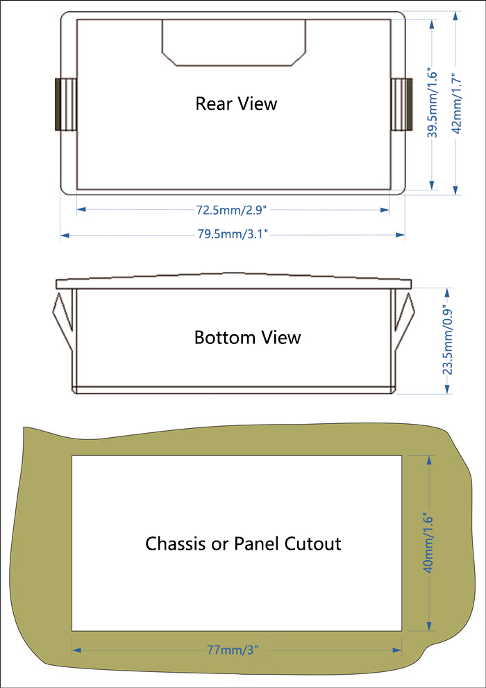 - Installation panel/chassis opening size: 77 x 40mm/3 x 1.6"