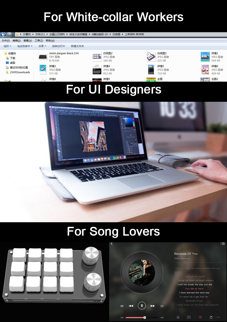 - 360-degree metal knobs replace roller: Support zoom out, zoom in, volume +, volume -, previous song and next song