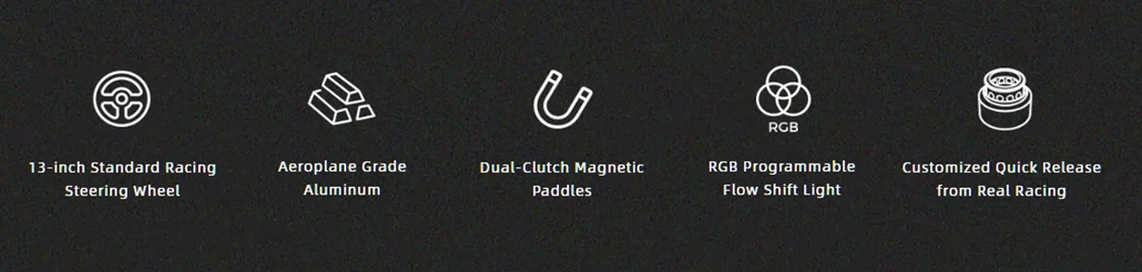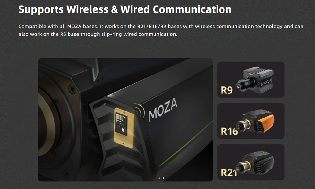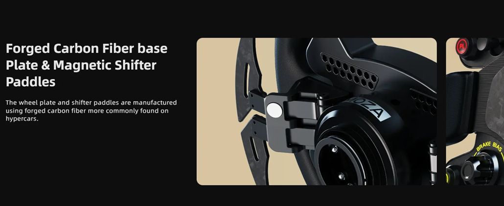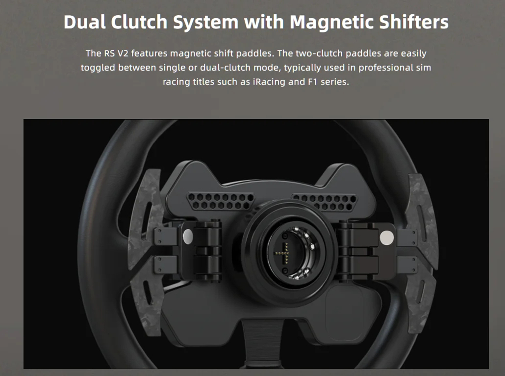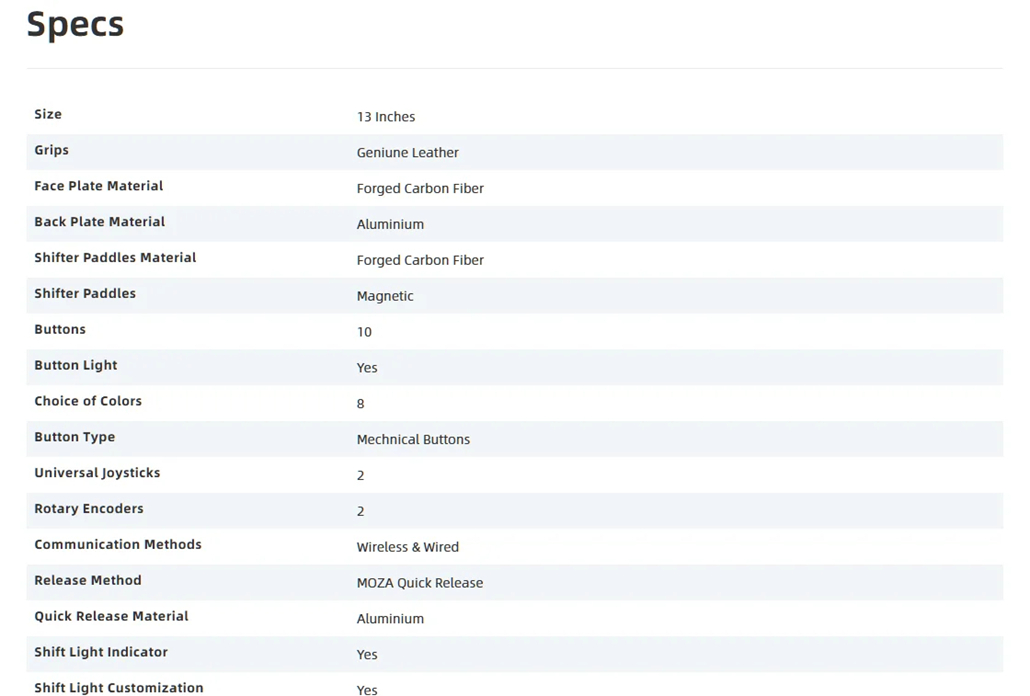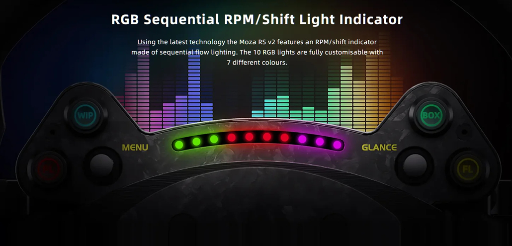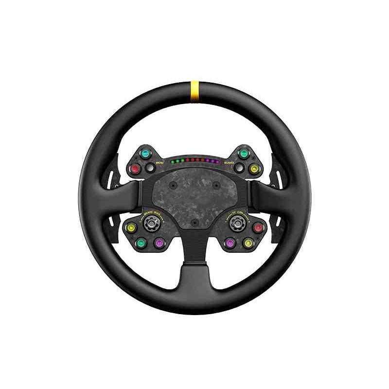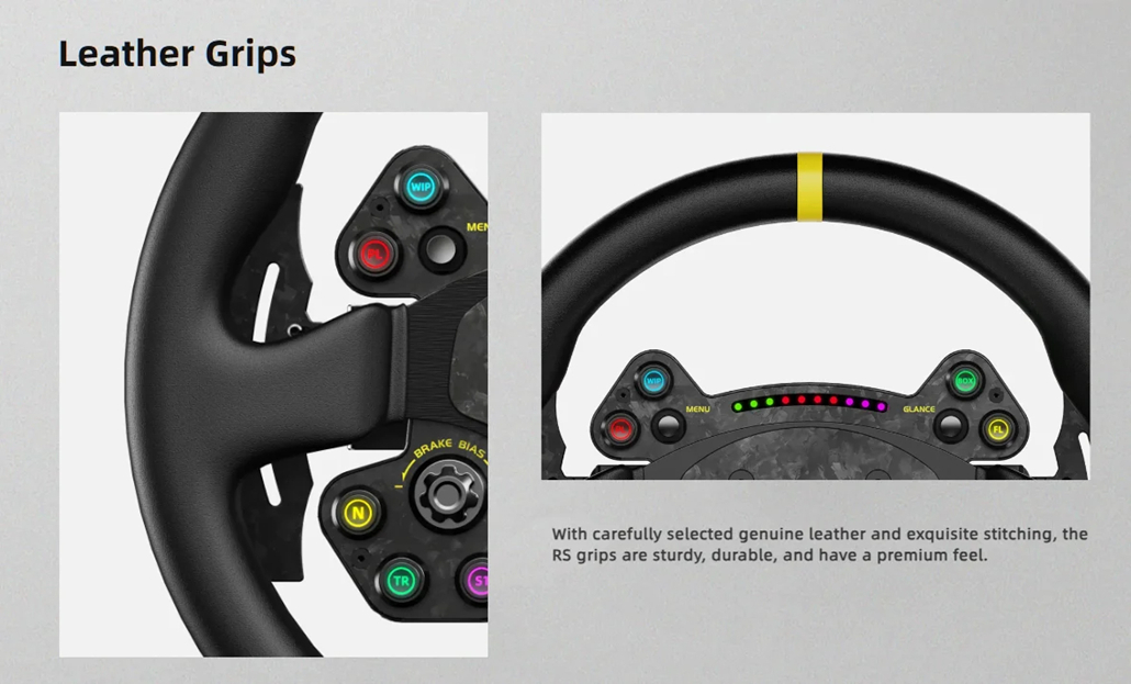 Upgrade your sim racing setup with the RS sim racing steering wheel. This GT wheel offers compatibility with all MOZA wheelbases, seamlessly integrating for an optimized racing experience. Constructed using a combination of forged carbon fiber and aluminum, it ensures both resilience and elegance. Enjoy the 13-inch standard racing rim with an ergonomic design for utmost comfort during exhilarating races. Adorned with a genuine leather grip it provides a nice stylish touch. Effortlessly install and remove it with the built-in quick-release mechanism and choose between wireless or wired connections to match your preferences. The LED RGB Rev Light heightens your racing immersion while the carbon fiber magnetic shifters guarantee precise gear changes.