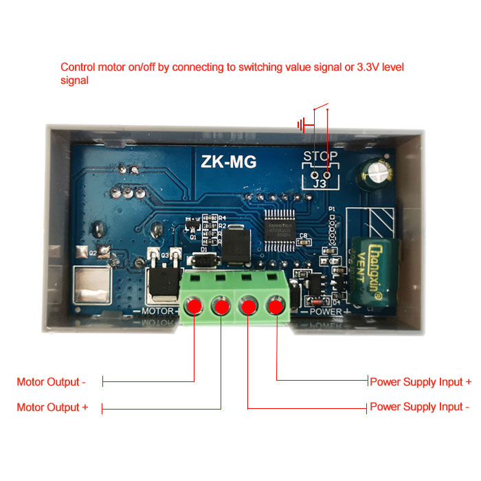 It can be connected to an external switch button or 3.3V level. Press the button to close it or lower the 3.3V level to switch the on/off state of your motor.
