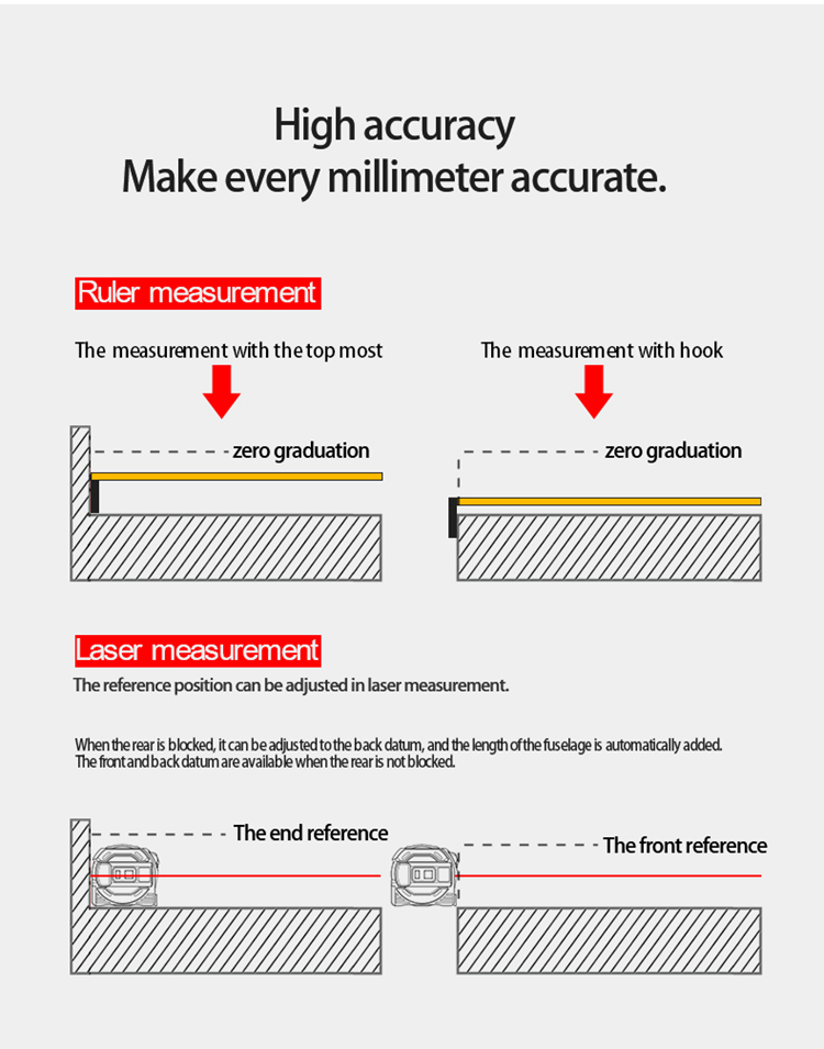 - Benchmark compensation, make every millimeter accurate, the hook is active when tape measuring